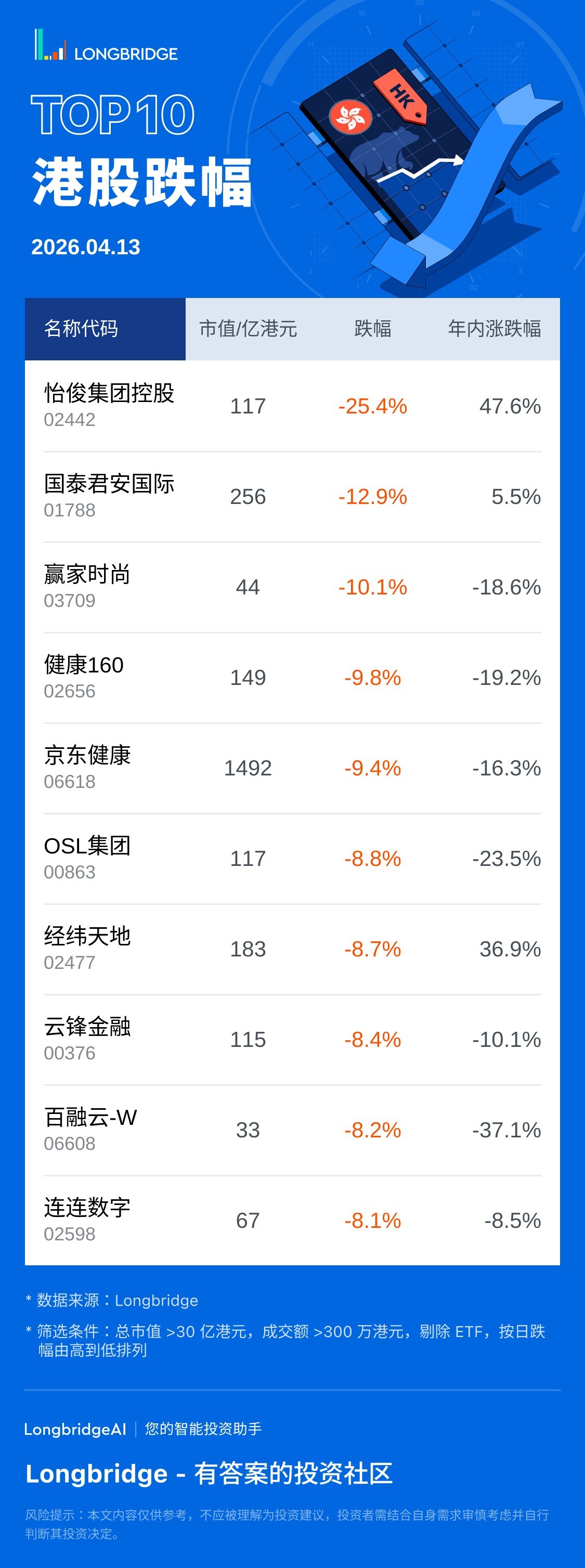 怡俊集团控股 (02442) 跌 25.36%,成交额 2278.1 万港元,年内累计涨 47.6%。