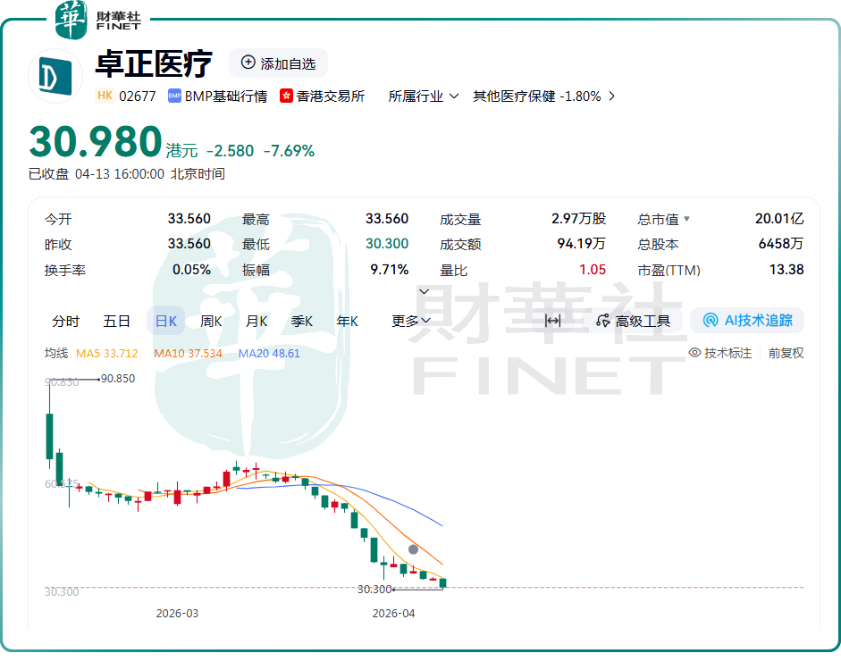 4月13日,在港股整体走弱市况下,定位于中高端医疗服务市场的连锁诊所集团——卓正医疗(02677.HK)股价再度下行,盘中一度下探至30.3港元,创上市以来新低;截至收盘,该股跌幅为7.69%,报30.98港元/股。