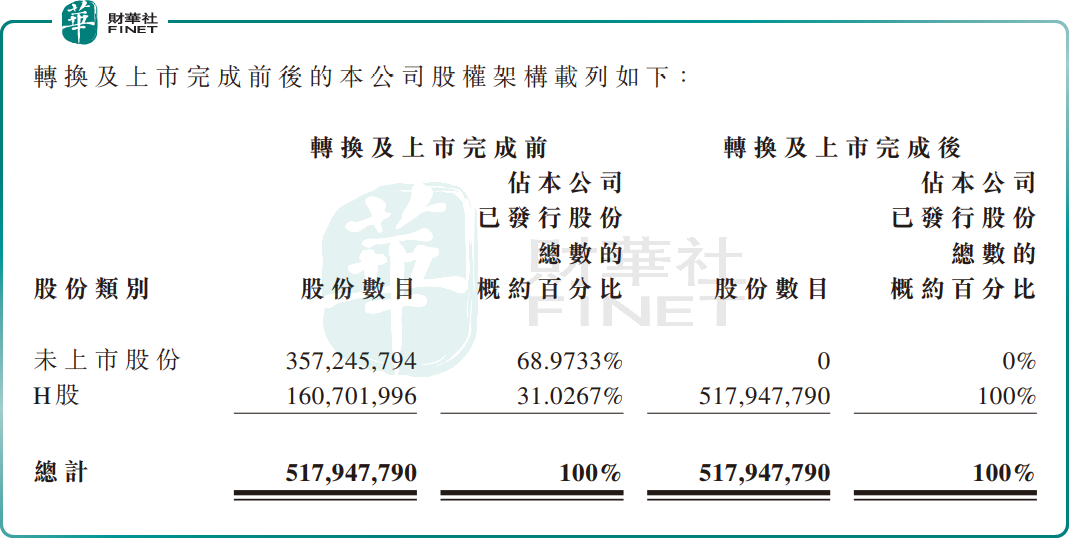 转换完成后,公司未上市股份将由3.57亿股(占比68.97%)降至零,H股将由1.61亿股(占比31.03%)增至5.18亿股(占比100%),实现全流通。