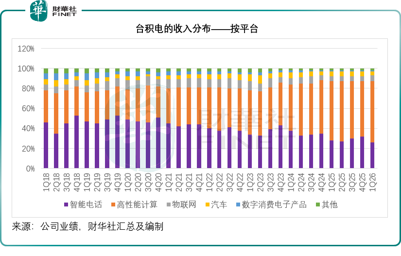 从平台来看,高性能计算和智能电话分别占其2026年第1季度收入的61%和26%,是主要的收入来源,其中高性能计算继续保持强劲的增长,期内按季上升20%,数字消费电子产品的按季增长也十分强劲,达到17%,或是因为较低的基数,其上季下降22%。