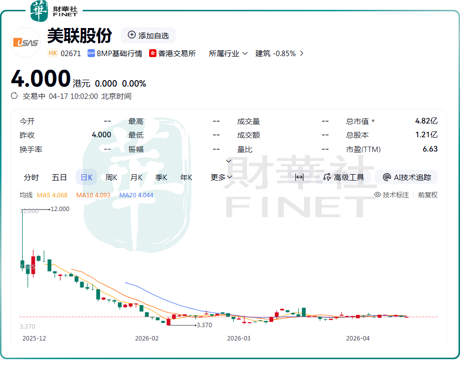 4月16日,美联股份(02671.HK)股价延续低迷走势,收盘跌幅为3.38%,报4港元/股。截至4月17日发稿,该公司股票更是出现无成交的情况,流动性显著匮乏。