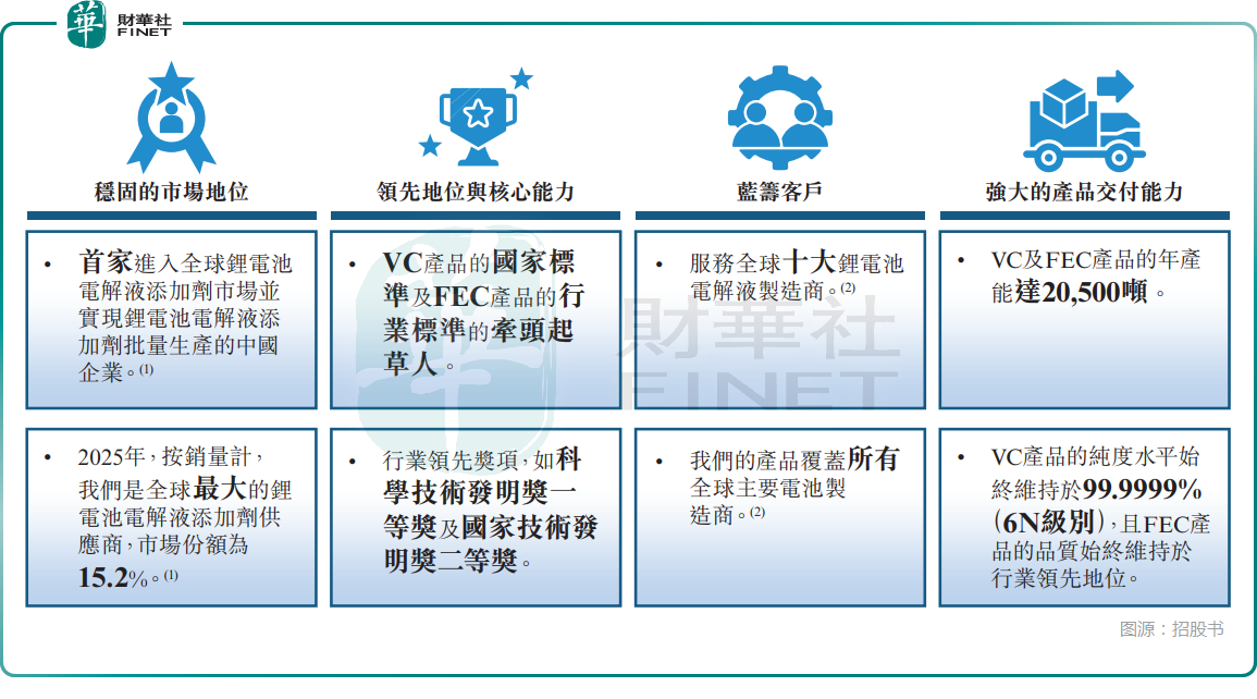 根据灼识咨询,自2005年起,华盛锂电在大多数年度中,按销量计,一直是全球最大的锂电池电解液添加剂供应商。于2025年,按销量计,公司是全球最大的锂电池电解液添加剂供应商,市场份额为15.2%。