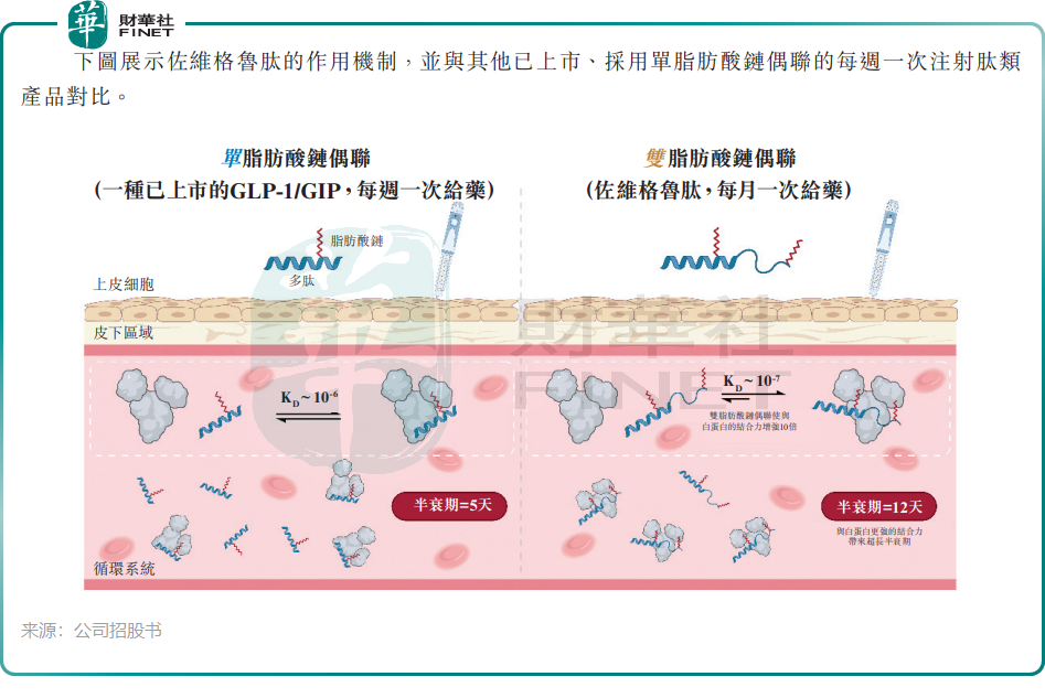 招股书显示,ZT002在I期临床试验中展现出了良好的安全性和耐受性,减重效果具有竞争力,每月一次给药方案得益于其QLLong平台的双脂肪酸链偶联技术,该技术使其与白蛋白的结合亲和力相较于替尔泊肽提高了约九倍,并将终末半衰期延长至约12天(替尔泊肽约为5天)。