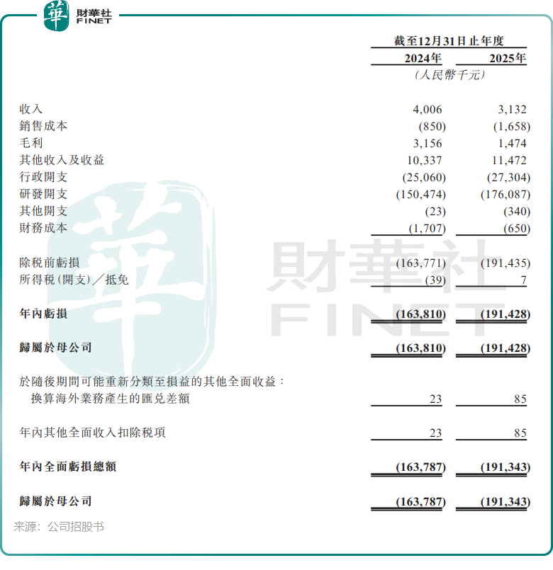 招股书显示,2024年和2025年,公司分别实现收入400.6万元(单位人民币,下同)和313.2万元,主要来自少量研发服务和中间产品销售;同期净亏损分别为1.64亿元和1.91亿元,亏损规模持续扩大。