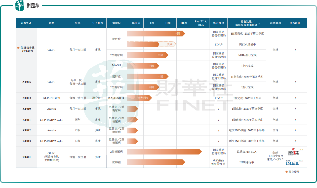 在核心管线之外,质肽生物还构建了较为完善的产品梯队,例如,ZT006是每日一次或每周一次的口服GLP-1多肽,目前已进入II期临床,有望解决注射剂型的痛点;ZT003是GLP-1/FGF21双靶点融合蛋白,已进入I期临床,在减重的同时还能改善代谢指标;此外,公司还储备了ZT011、ZT013等多靶点产品,长远来看将与ZT002形成协同效应。