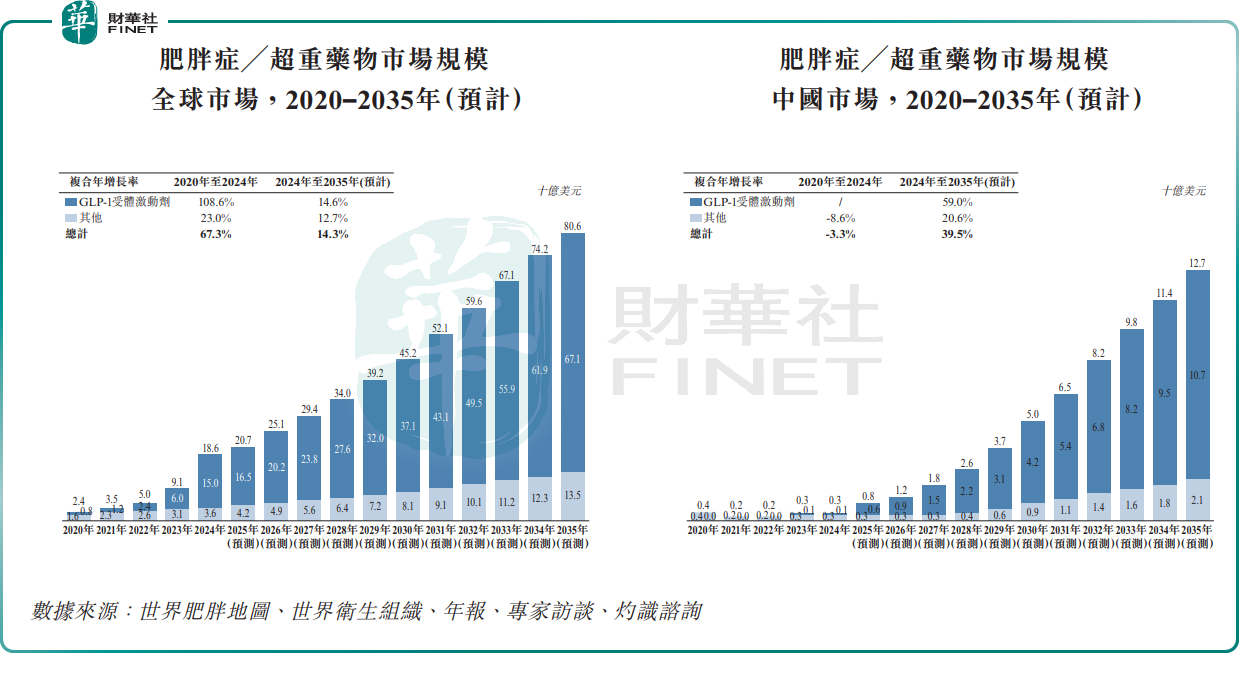 全球肥胖症/超重药物市场正处于爆发式增长期,数据显示,市场规模已从2020年的约24亿美元飙升至2024年的约186亿美元,四年间年均复合增长率高达67.3%;预计到2035年,全球市场规模将突破800亿美元,成为医药行业最具想象力的黄金赛道之一。