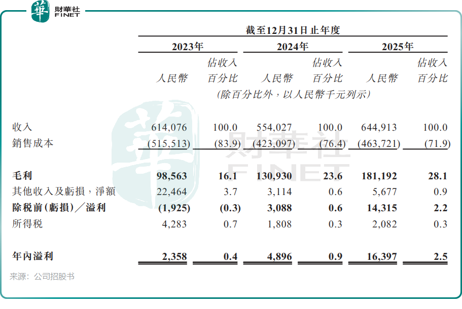 业绩方面,戴纳科技过去几年的收入表现不稳定,2024年收入出现下滑,2025年增长至6.45亿元(单位人民币,下同),年内利润大幅增长至1639.7万元。公司毛利率则表现抢眼,2023年至2025年分别为16.1%、23.6%及28.1%。