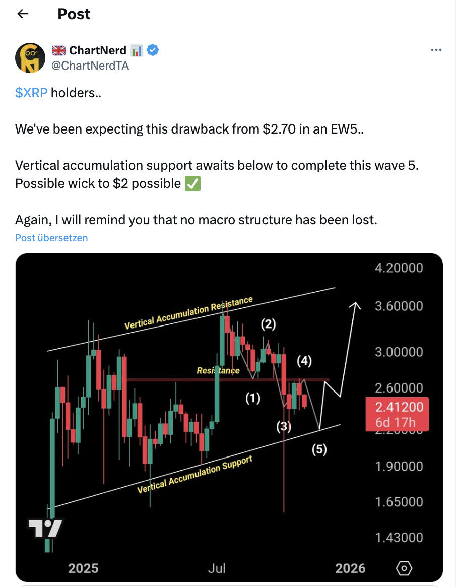 Laut Chartanalyst „ChartNerd“ befindet sich XRP in der letzten Phase einer größeren Korrektur, die begann, als der Kurs bei 2,70 US-Dollar ein Zwischenhoch markierte. Seine Analyse deutet auf eine mögliche Bodenbildung im Bereich um 2,00 US-Dollar hin – genau dort, wo sich in früheren Marktzyklen starke Unterstützungen gebildet haben. „Ein kurzer Dip auf 2,00 US-Dollar ist möglich“, so ChartNerd, „aber die langfristige Struktur bleibt intakt.“