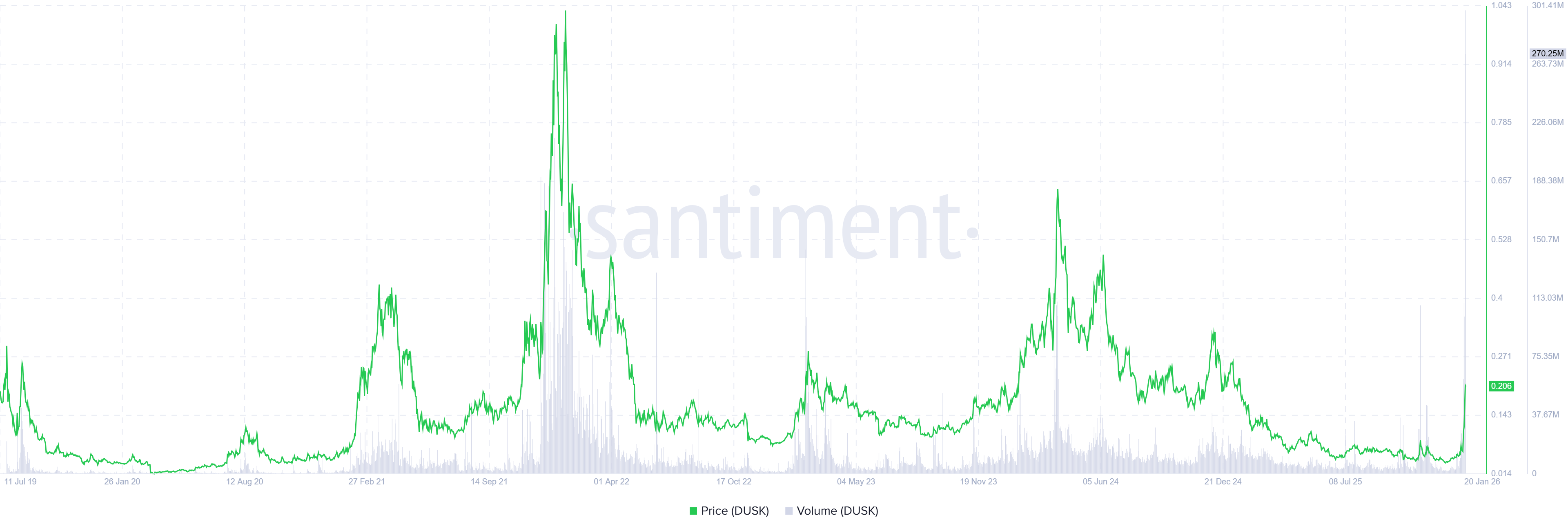 Auch On-Chain zieht die Aktivität deutlich an: Santiment beziffert das aggregierte Handelsvolumen im DUSK-Ökosystem (über Exchange-Anwendungen auf der Chain) am Montag auf einen Rekordwert von 298,43 Mio. US-Dollar; am Dienstag lag es bei rund 264,16 Mio. US-Dollar. Der Volumenschub deutet auf stark erhöhte Liquidität und Aufmerksamkeit rund um DUSK hin.