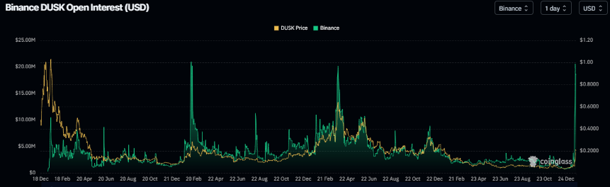 DUSK (DUSK) hält sich am Dienstag über 0,20 US-Dollar, nachdem der Token am Montag um mehr als 31% zugelegt hatte. In der vergangenen Woche hat sich DUSK um mehr als das 1,75-Fache verteuert. Rückenwind kommt von auffälligen Anstiegen bei Derivatemetriken und On-Chain-Aktivität – zudem rückt eine am Montag angekündigte Kooperation mit Chainlink in den Fokus.