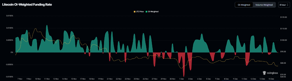 Zusätzlich verstärkt der Derivatemarkt den negativen Eindruck. Laut CoinGlass (OI-Weighted Funding Rate) überwiegen aktuell Trader, die auf weiter fallende LTC-Kurse setzen. Die Funding Rate dreht am Dienstag ins Negative und liegt bei -0,002 % – damit zahlen Shorts Longs. Historisch war ein Wechsel in den negativen Bereich bei Litecoin häufig ein Signal, dass der Markt bereit ist, die Abwärtsbewegung zu verlängern, statt sie auszusitzen.