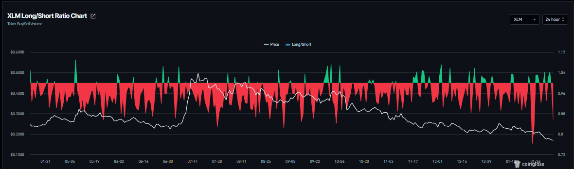 Gleichzeitig schwindet das Interesse der Investoren massiv. Das Open Interest (OI) bei Stellar-Futures ist auf 95 Millionen US-Dollar zusammengeschmolzen. Dies markiert den niedrigsten Stand seit November 2024. Analysten werten die Kombination aus fallenden Preisen und sinkendem Open Interest oft als Zeichen dafür, dass frustrierte Long-Händler ihre Positionen glattstellen und dem Markt den Rücken kehren.