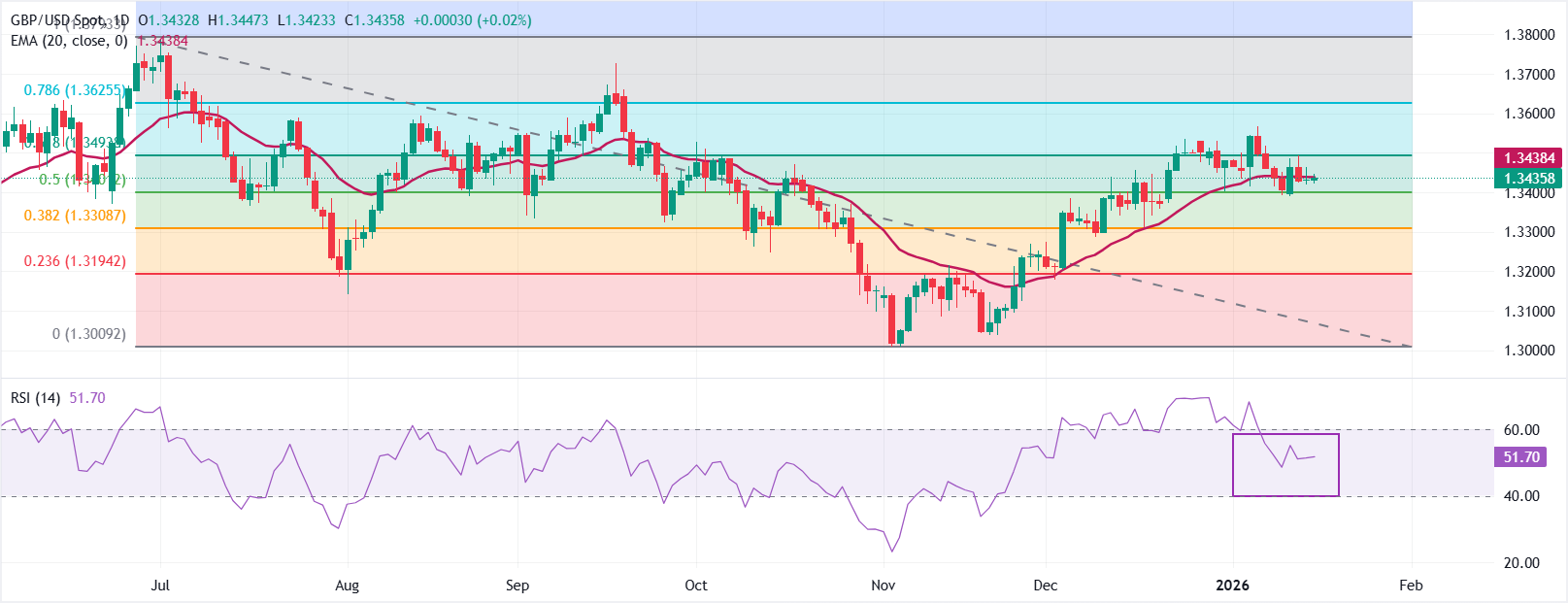 GBP/USD handelt zum Zeitpunkt des Schreibens niedriger bei etwa 1,3436. Der 20-Tage-Exponential Moving Average (EMA) bei 1,3438 hat sich nach einem stetigen Anstieg abgeflacht, wobei der Preis um ihn herum schwebt.