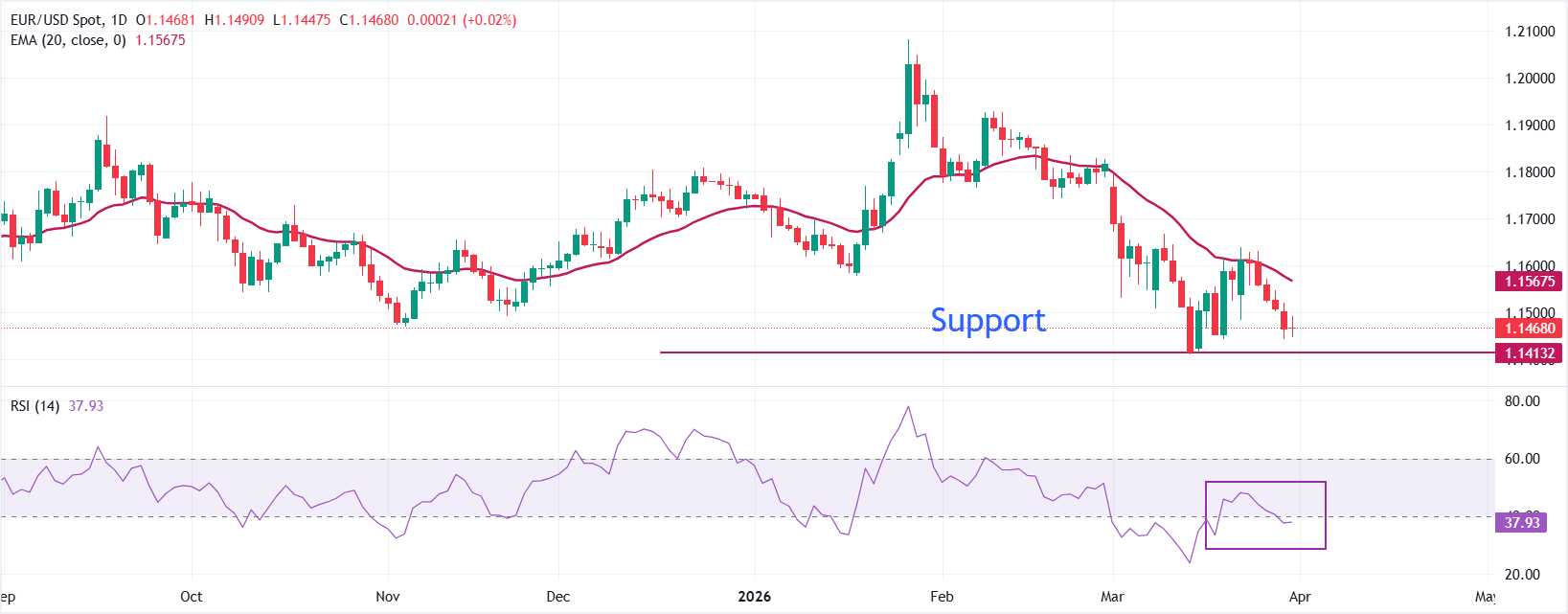 Der EUR/USD notiert zum Zeitpunkt der Erstellung dieses Berichts leicht höher bei rund 1,1468. Die kurzfristige Tendenz bleibt bärisch, da der Kurs weiterhin niedrigere Hochs und niedrigere Tiefs unter dem absteigenden 20-Tage-Exponential Moving Average (EMA) bildet, der nun bei etwa 1,1570 liegt. Das jüngste Scheitern, Erholungen in Richtung des 20-Tage-EMA aufrechtzuerhalten, unterstreicht den anhaltenden Verkaufsdruck, während der RSI, der wieder unter 40,00 fällt, den Beginn eines schwachen Momentums signalisiert. Solange der Kurs unter dem 20-Tage-Durchschnitt bleibt, erscheinen Rallyes als Korrekturen innerhalb einer breiteren Abwärtsphase.