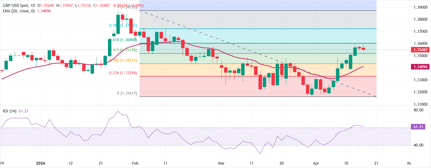 GBP/USD notiert zum Zeitpunkt der Analyse bei rund 1,3545 tiefer. Das Paar hält sich über dem 20-Tage-Exponential Moving Average (EMA) bei 1,3410 und hat das 50,0%-Fibonacci-Retracement des Schwungs von 1,3162 bis 1,3872 bei 1,3517 zurückerobert, was zusammen eine konstruktive kurzfristige Tendenz signalisiert.