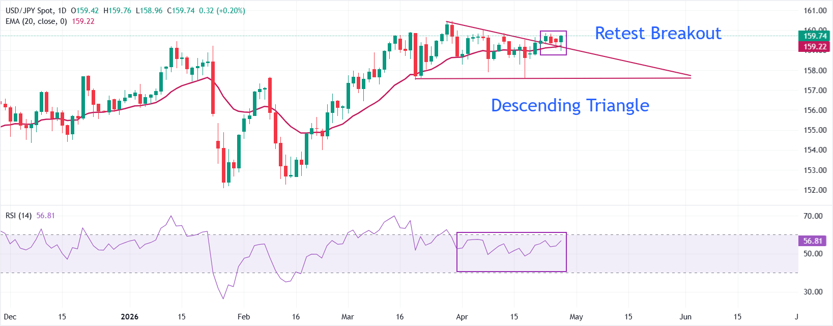 Auf der Oberseite liegt der unmittelbare Widerstand beim Hoch vom März bei 160,46. Nach unten hin bietet der 20-Perioden-EMA bei 159,22 die erste Unterstützung, während die horizontale Unterstützung des oben genannten Chartmusters bei etwa 157,57 als tiefere strukturelle Untergrenze fungiert; ein Tagesschlusskurs unter diesem Bereich würde den aktuellen bullishen Ton abschwächen und den Weg für eine breitere Korrektur öffnen.