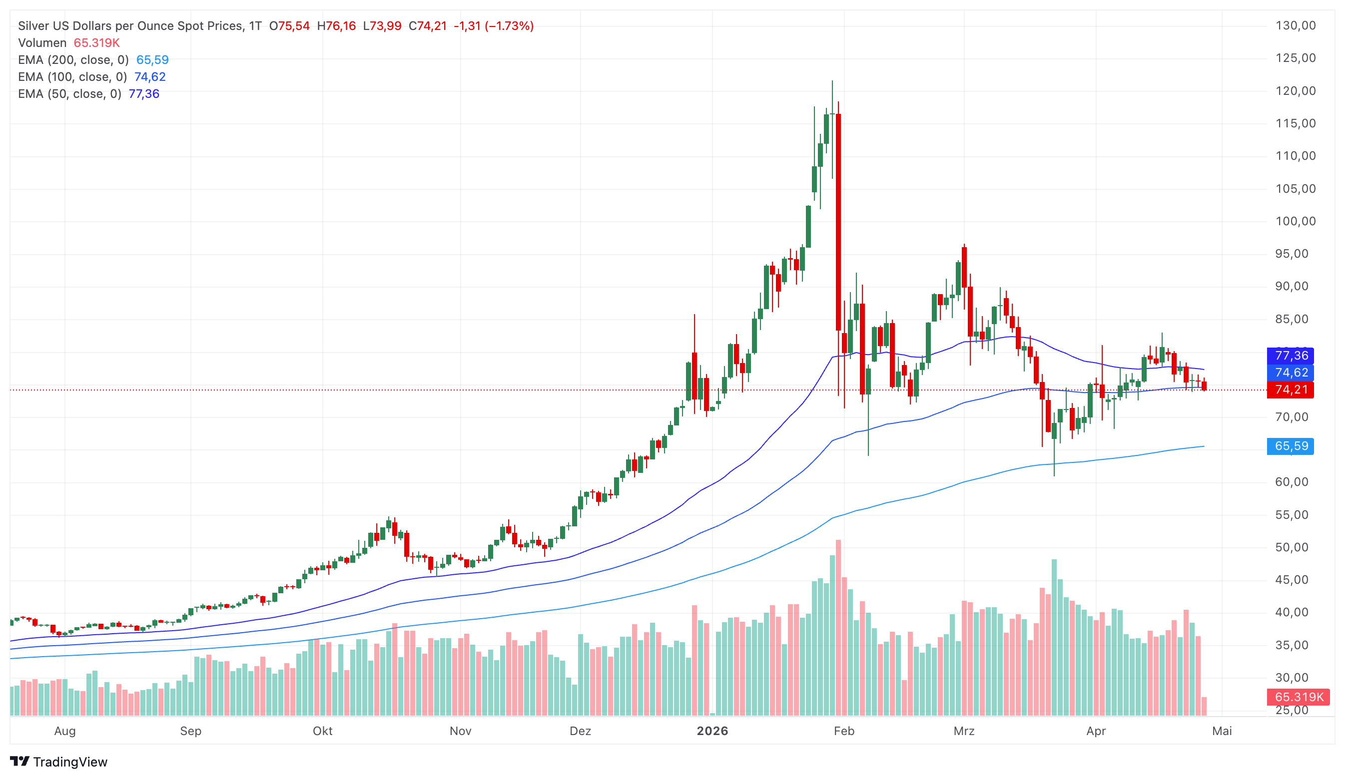 Stand 28. April 2026: Der Silberpreis dümpelt am Morgen und im frühen Handel vor sich hin. Kurse zwischen 75,67 und 75,84 US-Dollar je Unze – ein Mini-Plus von gerade einmal 0,1 bis 0,3 %. Das klingt harmlos. Ist es aber nicht.