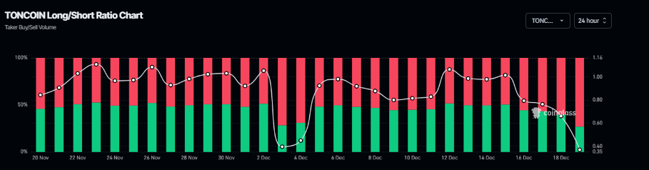 Darüber hinaus lag das Long-to-Short-Verhältnis von TON am Freitag bei 0,36, dem höchsten Niveau seit einem Monat. Ein Verhältnis unter eins deutet auf ein zunehmendes bärisches Sentiment hin, da Händler auf einen Rückgang des Vermögenswertpreises setzen.