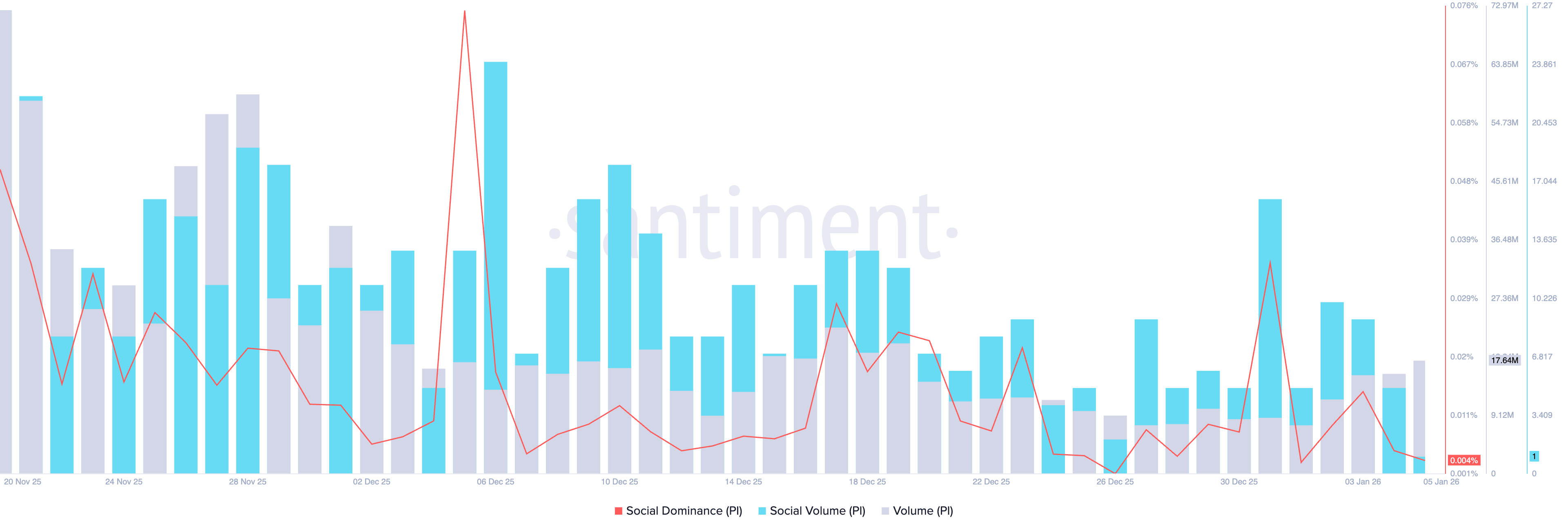 Das Pi Network (PI) bleibt zum Zeitpunkt der Presse am Montag stabil über 0,2100 USD, nach einer sechs-tägigen Erholungsphase im Zuge der breiteren Gewinne des Kryptomarktes, die durch die Spannungen zwischen den USA und Venezuela angetrieben wurden. Daten zeigen ein begrenztes soziales Interesse an PI trotz des steigenden Handelsvolumens. Der technische Ausblick für PI bleibt gemischt, da der 50-Tage-Exponential Moving Average (EMA) als wichtiger Widerstand fungiert.