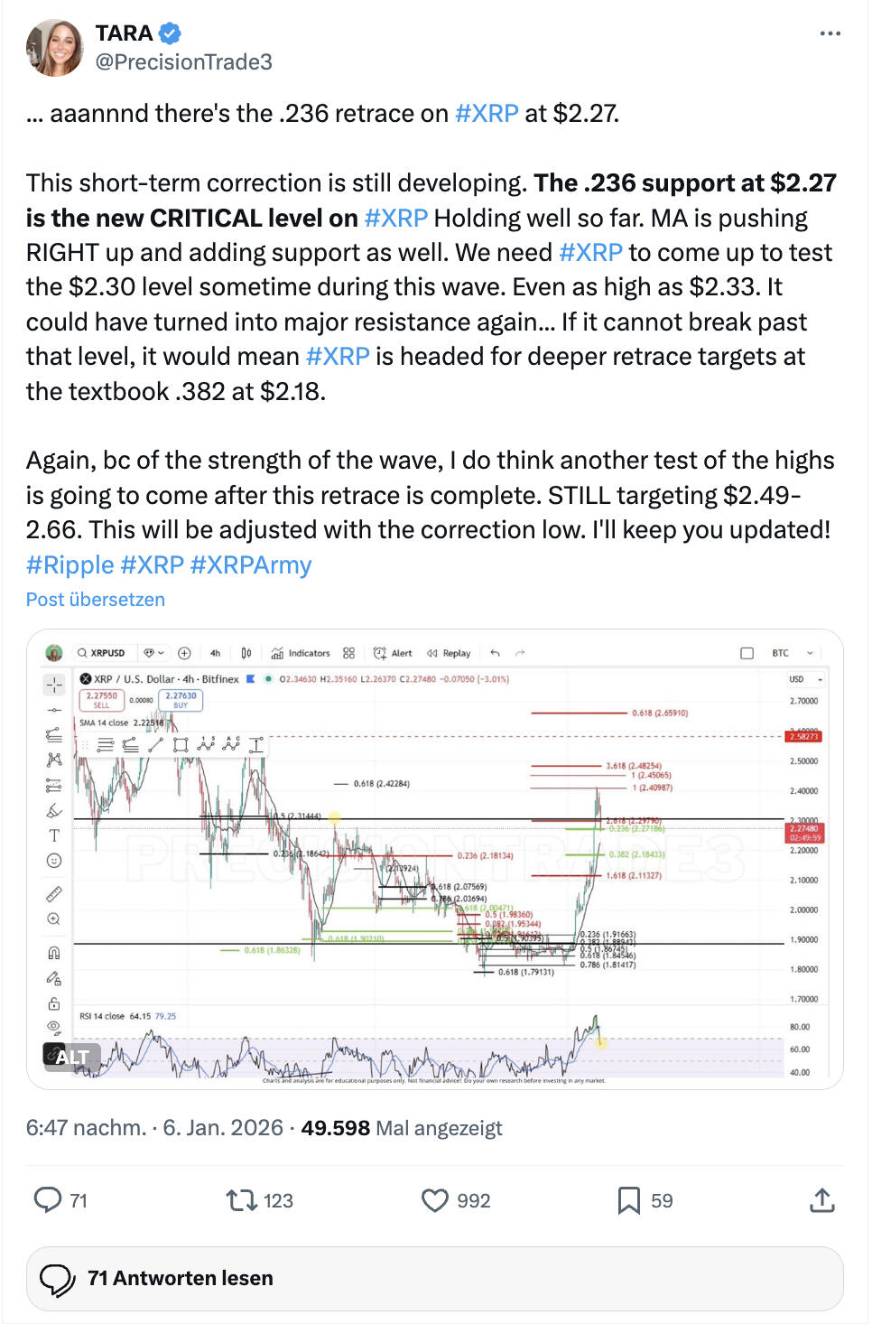 Im Zentrum steht die Marke von 2,27 US-Dollar. Sie ist mehr als nur eine runde Zahl. Hier verläuft das 0,236-Fibonacci-Retracement, ein technisches Level, auf das professionelle Trader besonders achten. Krypto-Analystin Tara nennt diese Zone sogar das „neue kritische Level“ für XRP. Zusätzlich läuft ein steigender gleitender Durchschnitt genau in diesen Bereich hinein. Technik trifft Psychologie – eine Kombination, die aktuell als Preispuffer wirkt.