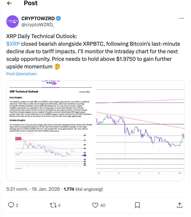 XRP müsse sich über 1,975 US-Dollar halten, um neues Aufwärtsmomentum aufzubauen. Und genau diese Marke wird aktuell getestet. Es ist kein technisches Detail – es ist eine Entscheidungslinie.