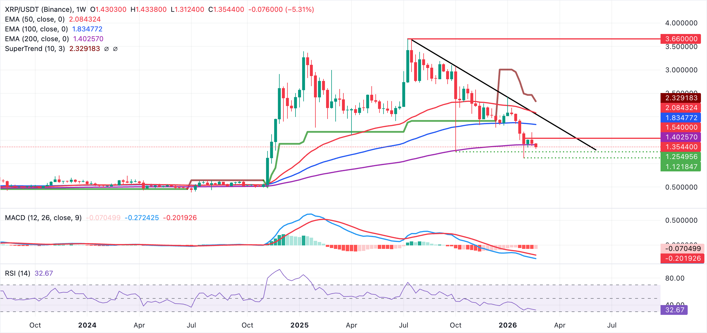 XRP notiert unter dem 50-Wochen-EMA sowie unter dem 100- und 200-Wochen-EMA. Diese gleitenden Durchschnitte bündeln sich zwischen 1,40 und 2,08 US-Dollar.