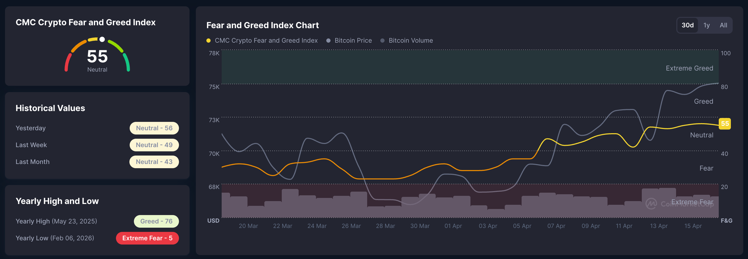 Die Nachfrage nach Dogecoin im Leverage-Markt nimmt zu, da die nachlassende Risikoaversion im breiteren Markt die Einzelhandelsnachfrage nach Meme-Münzen anheizt. Daten von CoinMarketCap zeigen den CMC Fear and Greed Index bei 55, was neutralen bis gierigen Niveaus entspricht und einen Anstieg gegenüber 32 am 1. April darstellt, was Angst signalisierte. Typischerweise schafft eine Verbesserung der Marktstimmung günstige Bedingungen für Meme-Münzen, um an Stärke zu gewinnen.