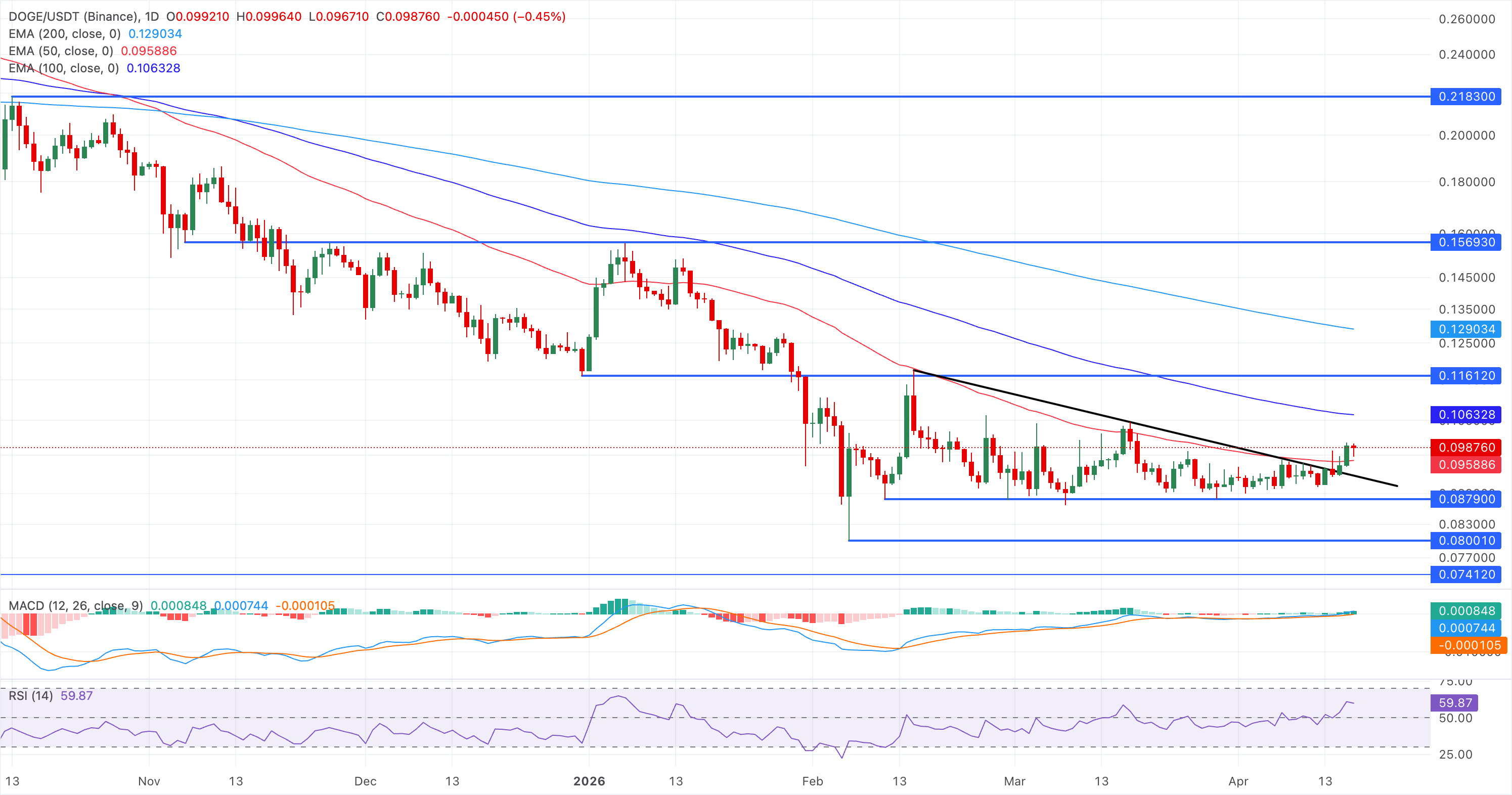 Dogecoin hält die Gewinne über dem kürzlich durchbrochenen 50-Tage-EMA bei 0,09588 USD, was auf einen moderat konstruktiven kurzfristigen Ton hindeutet. Allerdings deuten die absteigenden 100-Tage- und 200-Tage-EMAs auf einen breiteren Abwärtstrend hin.