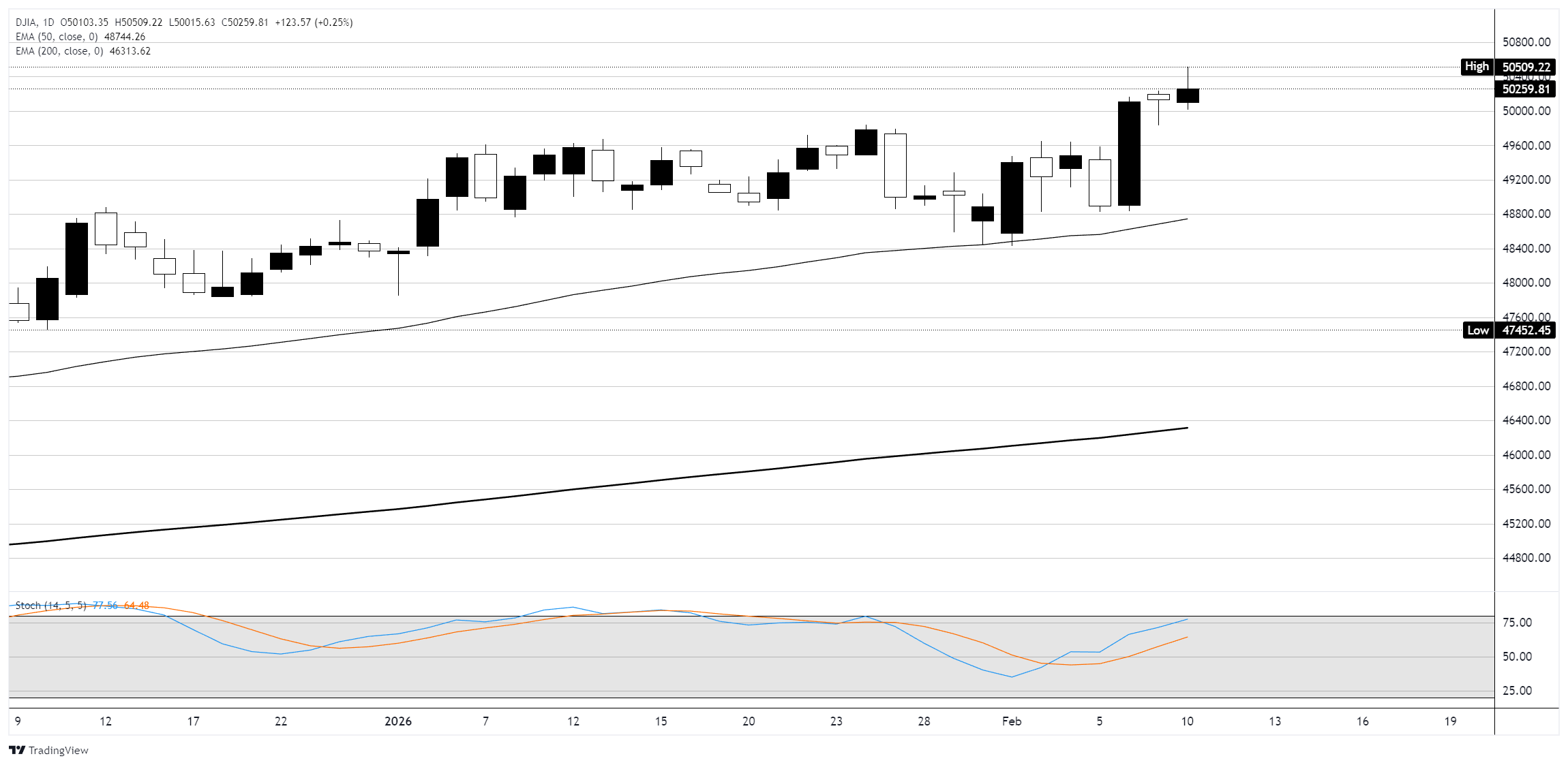 Der Dow Jones Industrial Average (DJIA) setzte am Dienstag seine Rekordserie fort und erreichte ein neues Allzeithoch im Intraday-Handel von 50.509,22, bevor er bei 50.259,81 schloss, was einem Anstieg von 123,57 Punkten oder 0,25% entspricht. Der Index hat nun sein viertes aufeinanderfolgendes Intraday-Rekordhoch erzielt und baut auf dem Momentum auf, das ihn letzte Woche erstmals über die 50.000-Marke getragen hat. Der S&P 500 gewann 0,47% und schloss bei 6.964,82, während der Nasdaq Composite um 0,90% auf 23.238,67 stieg. Die Gewinne waren breit gefächert, angeführt von Software-Aktien, die sich von dem KI-getriebenen Verkaufsdruck der letzten Woche erholten, während Finanz- und Unterhaltungsunternehmen weiteren Rückenwind für den blue-chip Dow gaben.