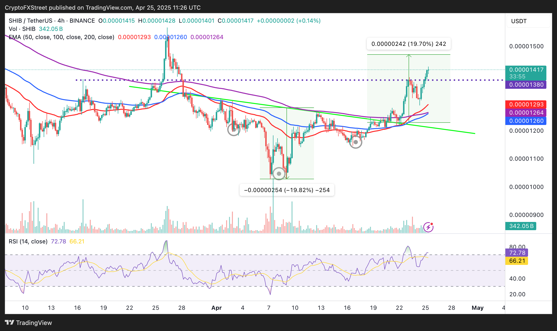 Der Preis von Shiba Inu baut seine Gewinne weiter aus und wird zum Zeitpunkt der Erstellung dieses Artikels bei 0,00001413 USDgehandelt, was ein wachsendes Interesse an digitalen Vermögenswerten und vor allem an Meme-Coins signalisiert. Zusätzlich zu einer allgemeinen Aufwärtswelle auf dem breiteren Markt für Kryptowährungen in dieser Woche, bestätigte SHIB am Sonntag einen Ausbruch aus einem inversen Kopf-Schulter-Muster auf dem 4-Stunden-Chart.