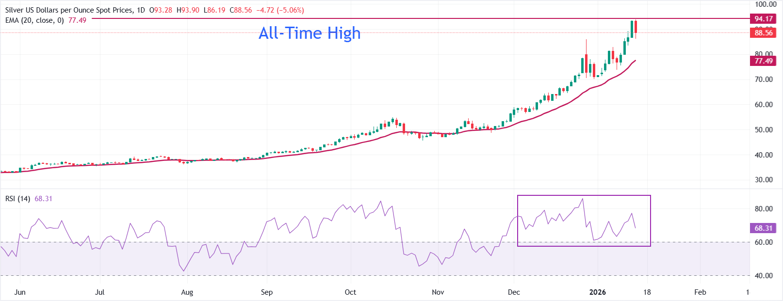 Silber (XAG/USD) erreicht in Asien nahe $90.00 ein neues Rekordhoch und steigt den vierten Tag in Folge. Safe-Haven-Nachfrage wegen Iran-Spannungen und Fed-Unabhängigkeitsdebatte; USD erholt nach Unterstützung für Powell. RSI 74.77 überkauft – Konsolidierung möglich.