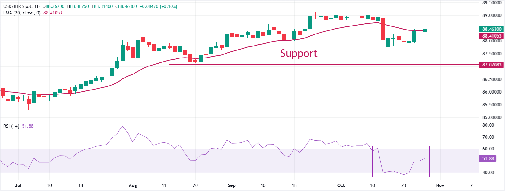 USD/INR rises to near 88.50 at open on Wednesday. The pair strives to return above the 20-day Exponential Moving Average (EMA), which trades around 88.41.
