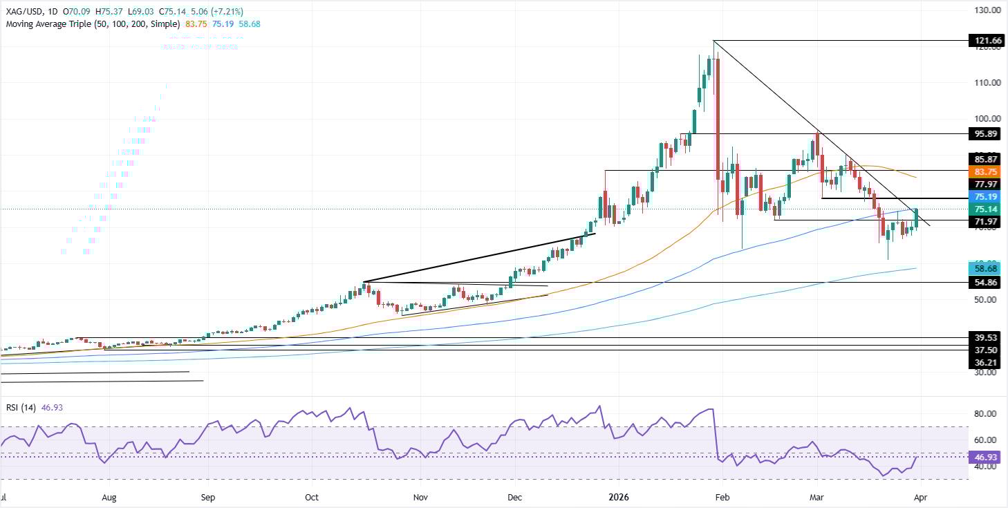 Silver Price Analysis: XAG/USD surges and clears 100-day SMA and $75