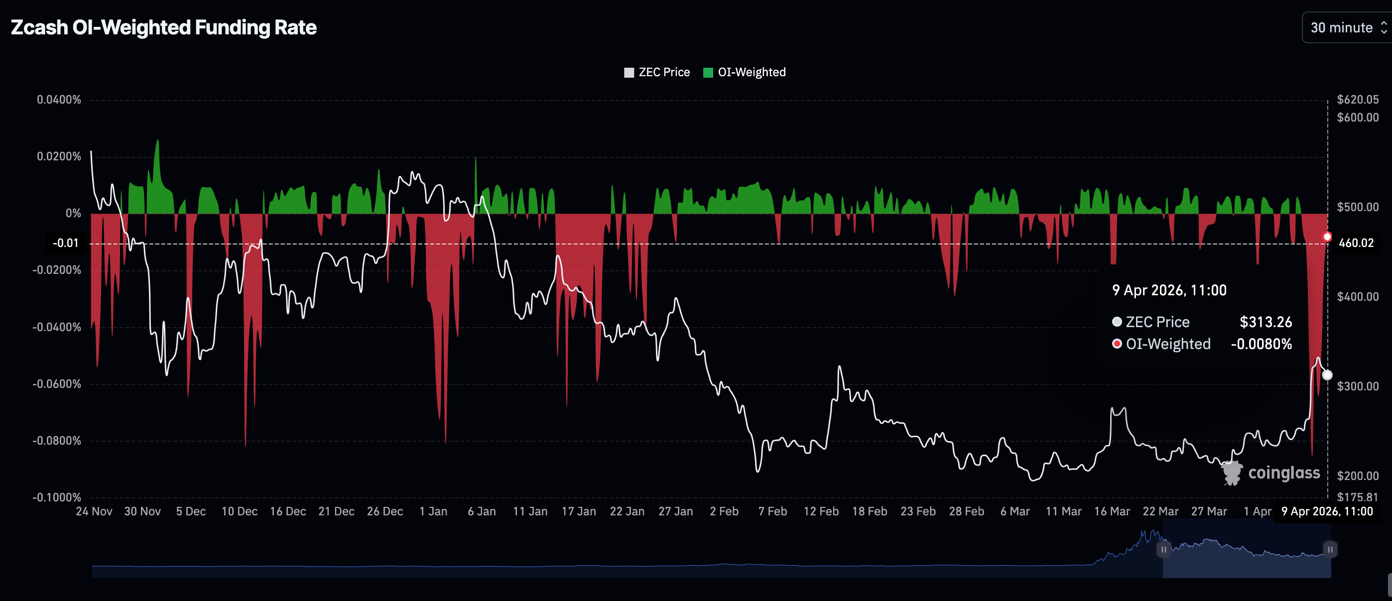 Meanwhile, traders appear to be losing conviction in ZEC’s ability to sustain its upswing, which may explain the surge in bearish bets, keeping the futures Open Interest (OI) weighted funding rate negative at -0.0080% on Thursday, down from 0.0064% the previous day. If the outlook fails to improve, pressure will continue to weigh on Zcash, risking confinement in a broader downtrend.