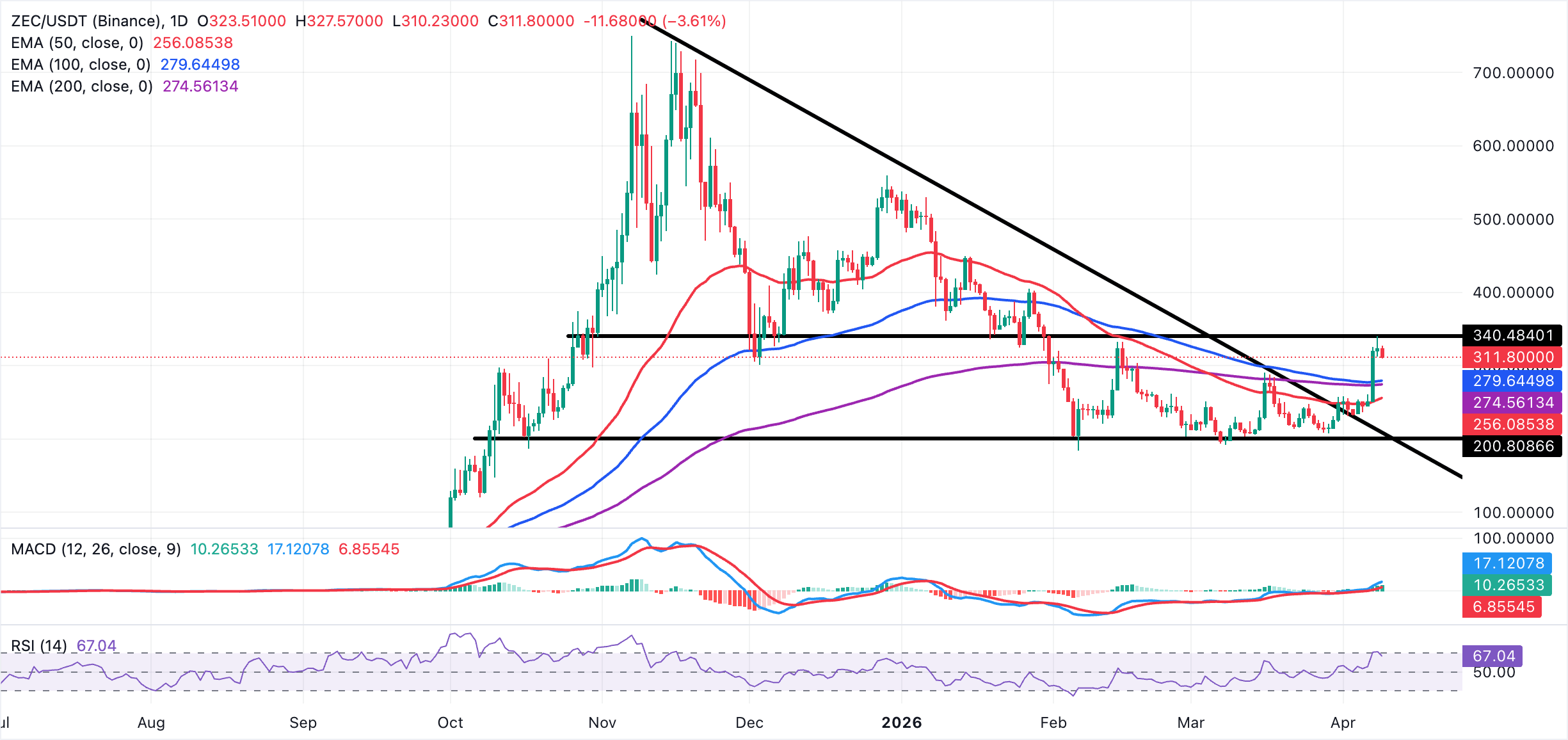 On the downside, ZEC's initial support is now seen at the recent price pivot around $300, where any shallow pullback could attempt to stabilize. Below that, a more meaningful support zone emerges from the 100-day EMA near $280 down to the 200-day EMA around $275, with the 50-day EMA lower at $256 offering an additional dynamic floor. Losing this broader band would expose the broken downward trendline area near $207 as the next major support region.