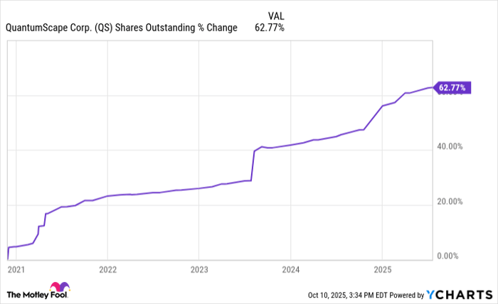 One downside of continued funding needs is shareholder dilution, which has held back QuantumScape stock and will be a further headwind in the years to come. QuantumScape's total shares outstanding are up 63% since going public. As shares outstanding go up, earnings per share (EPS) will go down, all else equal. This may not be noticeable for a company that doesn't yet generate revenue, let alone a profit, but is something long-term investors should track for QuantumScape, as it will help determine the share price performance.