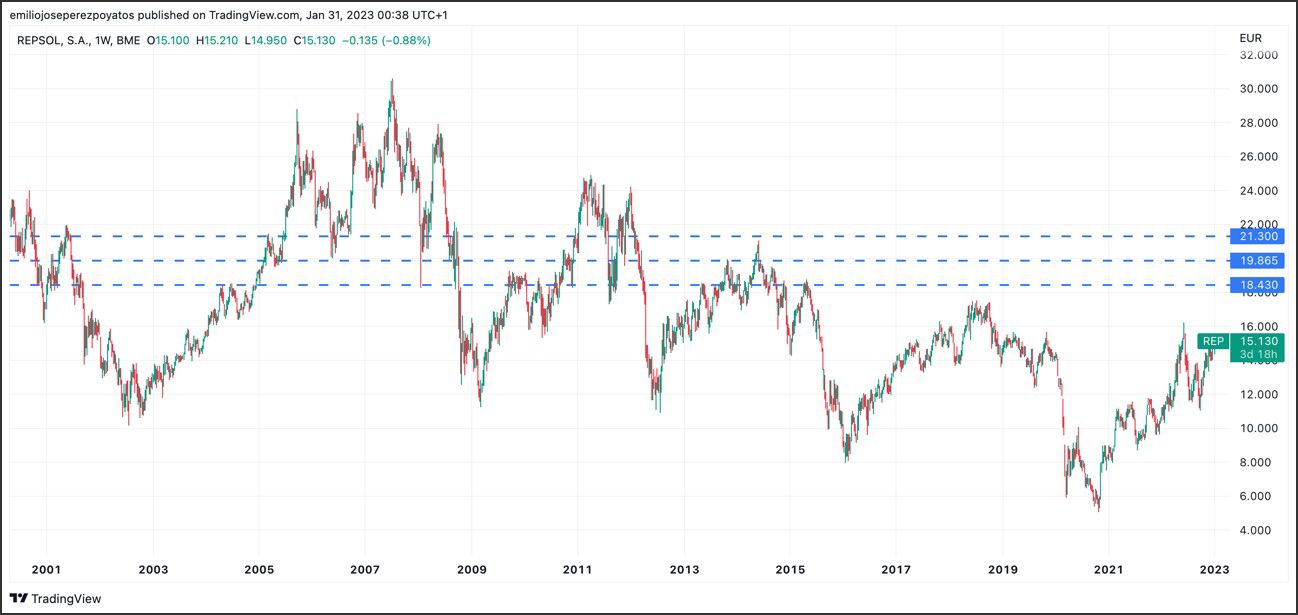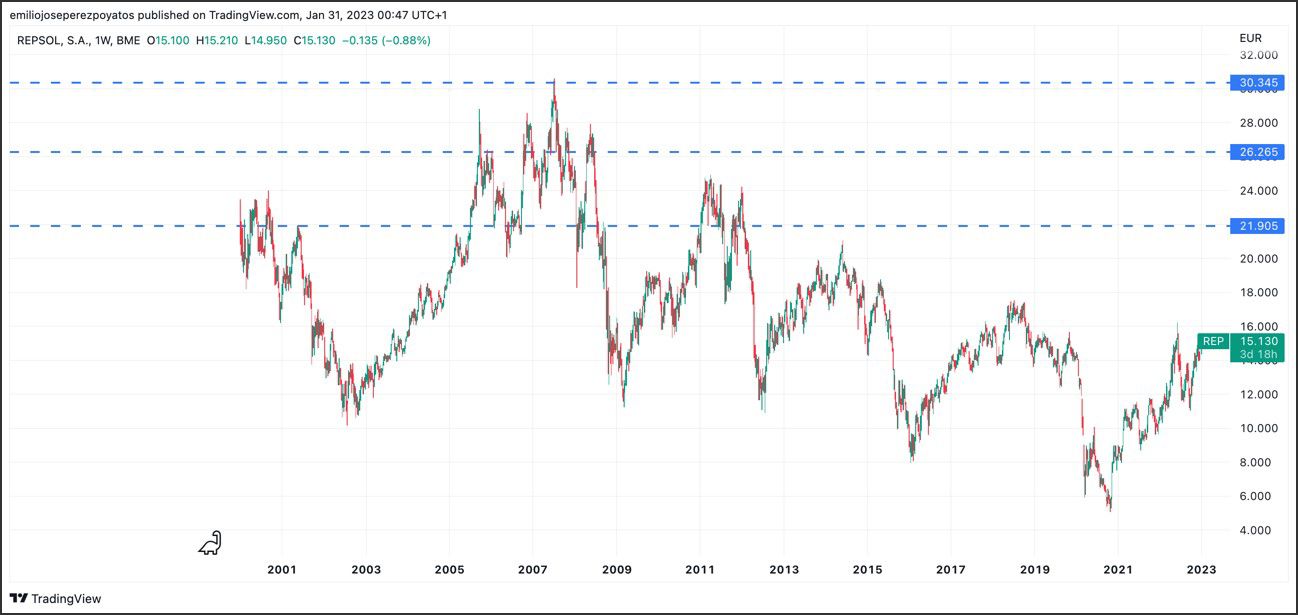Por supuesto, esto se traduce en un contexto desde la fecha de redacción del presente artículo hasta la anualidad completa. Debemos tener en cuenta que la cotización de Repsol el 1 de Enero de 2023 era de 14,950 €, por lo que la rentabilidad anualizada sería mayor.