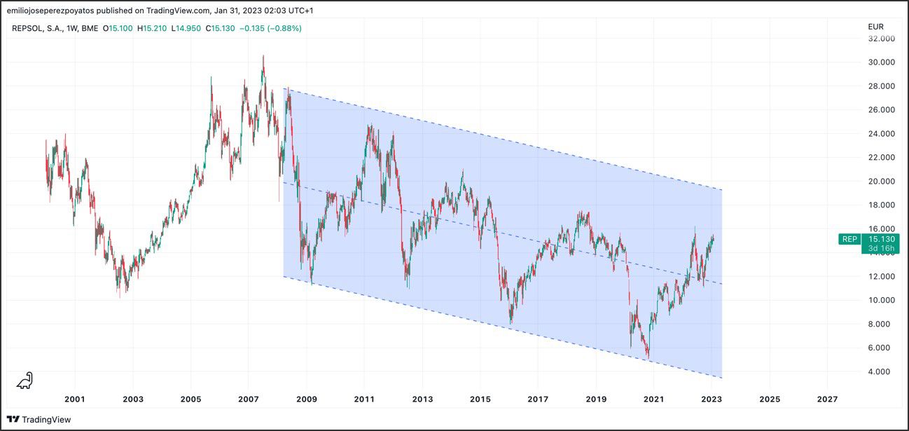 La cotización de Repsol tal y como la conocemos hoy día se remonta al año 2000, no obstante, desde el año 2008, coincidiendo con la caída de la economía financiera, nos adentramos dentro de un gran canal bajista en donde poco a poco la cotización fue cayendo aún y con repuntes puntuales: