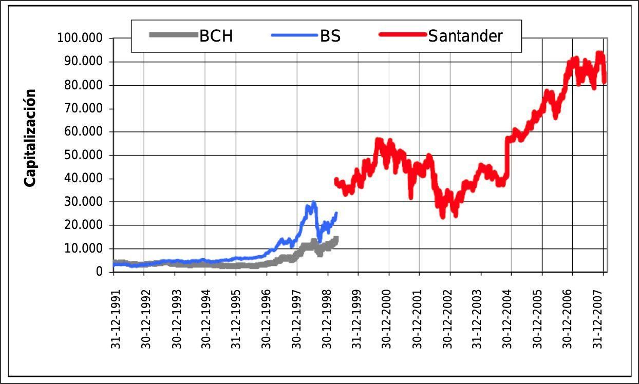Dado que el Banco Santander actual es fruto de una suma de decenas de entidades, vamos a centrar nuestro análisis desde la fusión que dio lugar al BSCH. Como ya hemos dicho, aquello se materializó en 1999, por aquel entonces lo primero fue dar a los accionistas 3 acciones del Banco Santander por cada 5 acciones del Central Hispano.