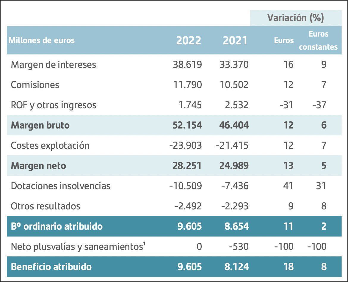 Sabemos que los resultados han aumentado un +12% en el ejercicio, alcanzando un beneficio ordinario de 9.605 millones de euros, principalmente gracias al crecimiento del margen de intereses que ha vivido el sector. En concreto, el margen de intereses comparado con 2021 se incrementó en un +16%, aunque las comisiones también coadyuvaron creciendo un +12%.