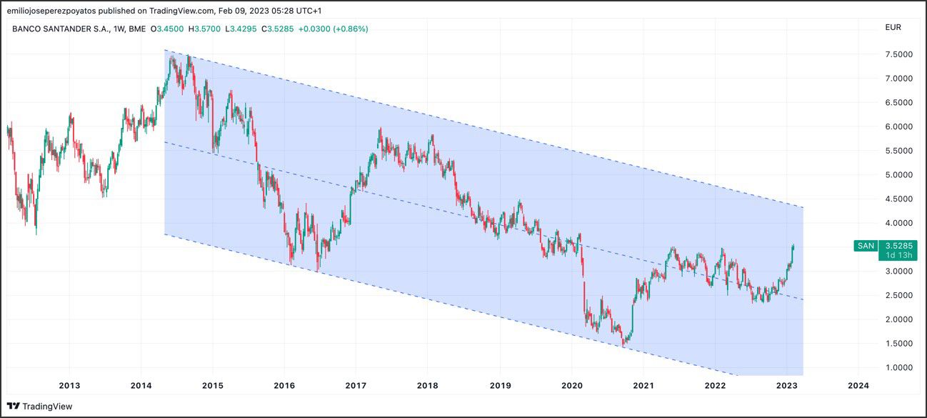 La gráfica semanal parece trazar un canal bajista prolongado que se inició a mediados de 2014. Una clara y positiva señal para el valor sería que se llegase a romper dicho canal, para lo cual es necesario que SAN supere los niveles de 4,33 €.