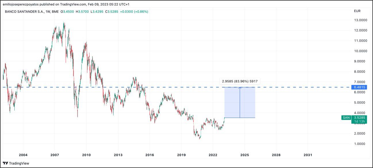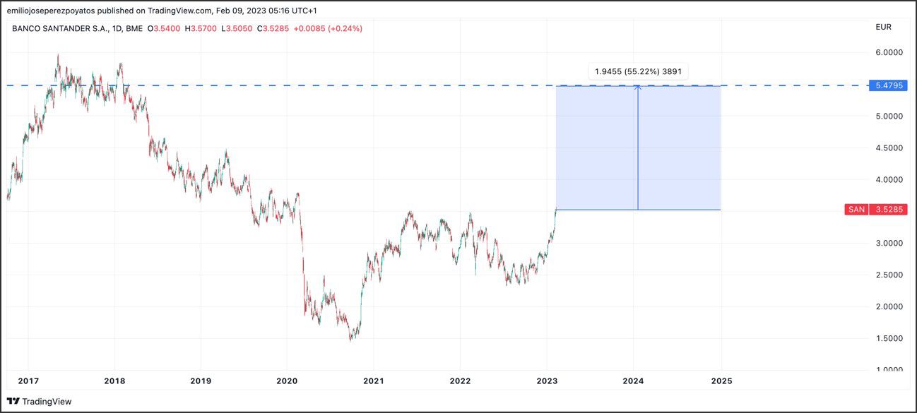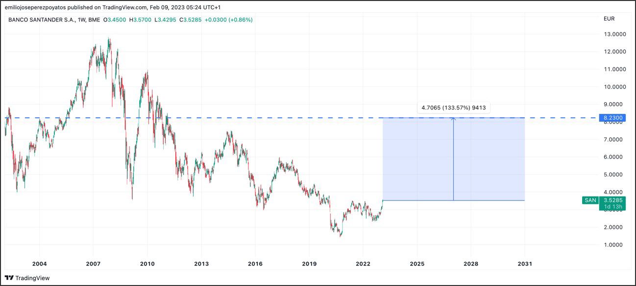 El pronóstico más alejado de todos sería para 2030. En esta tesitura prácticamente nadie se atreve a establecer fundamentales, por lo que sólo contaríamos con el margen que nos da el análisis técnico. Los chartistas en este sentido colocan el potencial de crecimiento de SAN hasta 8,23 €, lo que supone un +133% desde los niveles actuales.