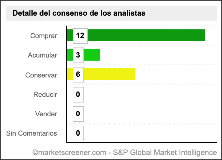 Según el consenso efectuado por S&P Global Market Intelligence8, sobre un total de 21 analistas que han expresado su valoración hay 12 que reafirman la posición de compra, 3 que optan por la acumulación y 6 que optan por mantener la acción. Por el contrario, no hay ninguna que prefiera la venta o reducción de peso en cartera.