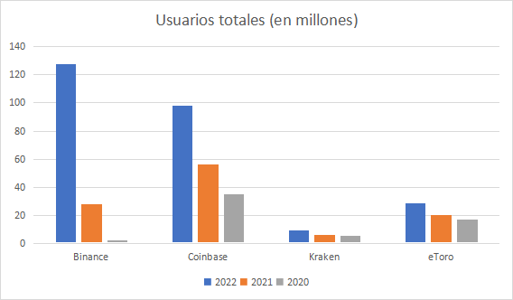 En cuanto al número de usuarios, Coinbase ha logrado mantener un crecimiento sólido a pesar de la caída del mercado de criptomonedas en 2022. Sin embargo, se observa cómo el crecimiento de Binance fue mucho más rápido en ese periodo, adelantando a Coinbase como la plataforma con más usuarios en 2022.