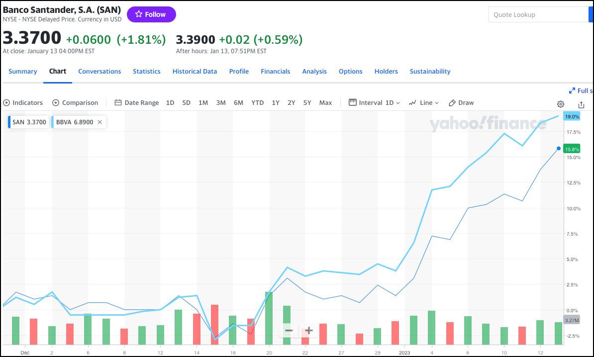 No obstante, también existen sombras para la banca en 2023, ya que el gobierno central español ha anunciado un nuevo impuesto a los beneficios de la banca para contrarrestar sus beneficios históricos ocasionados por las subidas de los tipos de interés, lo que reducirá sus beneficios en 2023 y 2024, años en los que está previsto el nuevo impuesto.
