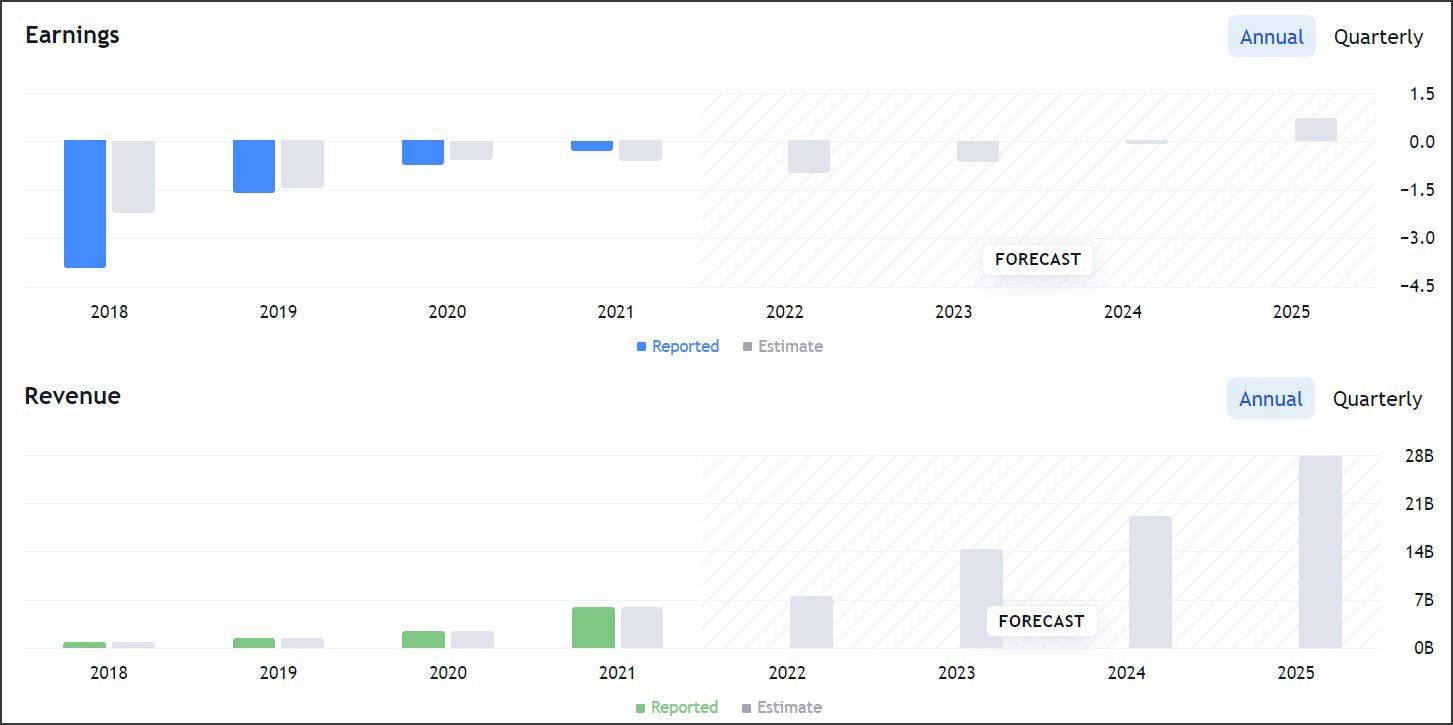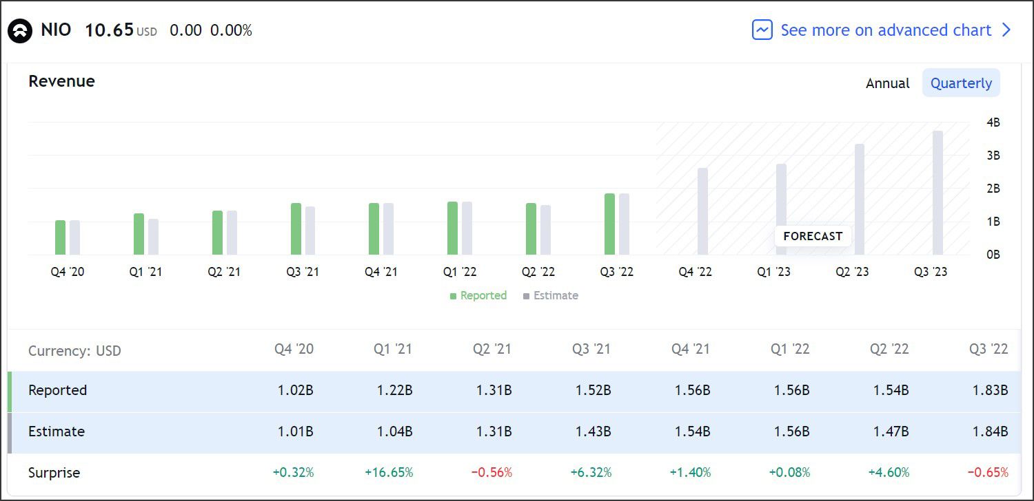 Las previsiones son positivas para la empresa, se está estimando que, a partir del 2025, Nio comenzará a obtener números verdes y tener ganancias, esto se deberá en gran medida al aumento en las ventas y disminución en costes de producción, la gráfica nos muestra ingresos por 5.69B en 2021, una estimación de 7.39B para el 2022 (del cuál se darán los resultados en marzo el 2023) y para el 2025 se pronostican ingresos muy cercanos a los 28B.