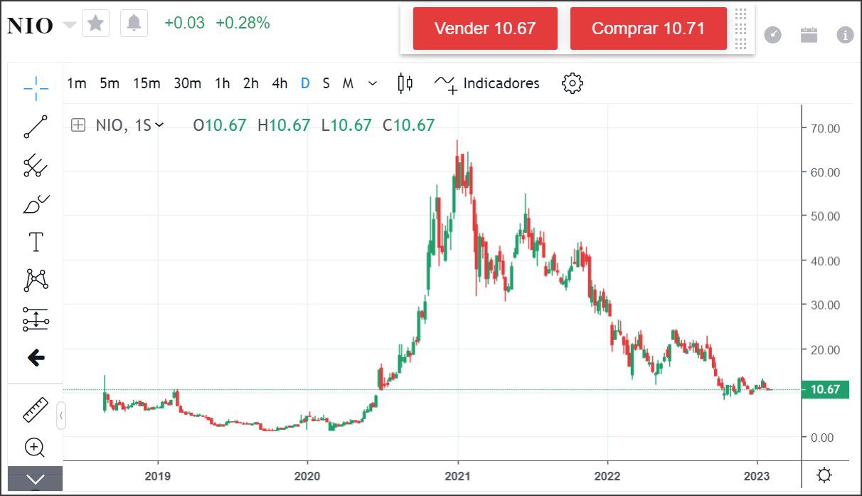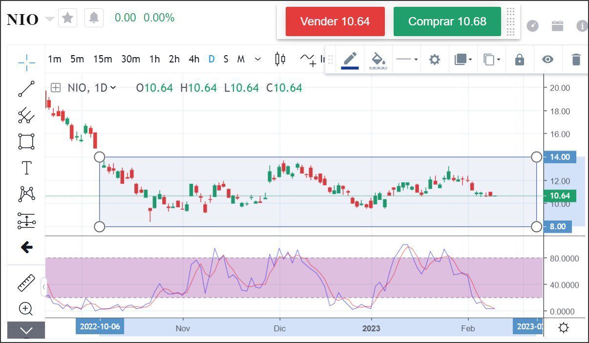 Actualmente, el 9 de febrero de 2023, la cotización de Nio es de 10.64 USD, el año inició en 10.24 y desde octubre del 2022 las acciones se han mantenido entre los 8 y 14 USD, el estocástico se encuentra en sobreventa en lo que podría significar un mínimo más alto que el anterior en enero.
