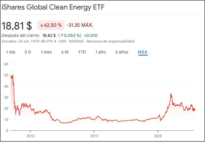 El siguiente gráfico muestra el mayor fondo de inversión cotizado, el iShares Global Clean Energy (ICLN) de Blackrock, que busca perseguir el desempeño de aproximadamente 100 empresas relacionadas con la energía limpia. Como se puede observar sus rentabilidades no tienen nada que ver con las de XLE analizado anteriormente, indicando que los inversores aún no apuestan por las renovables, y menos en este 2022 de escasez energética.