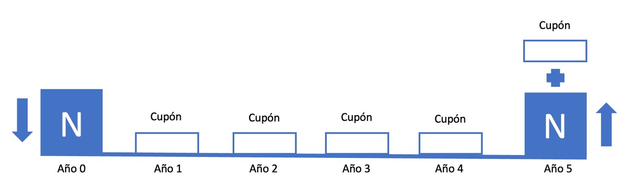 Aquí, podemos ver cómo sería un bono de cinco años con pago anual. En el inicio (Año 0) realizamos nuestra inversión ("N" o nominal) y a lo largo de los siguientes años vamos recibiendo los intereses en forma de cupón. Finalmente, en el quinto y último año recibiríamos el cupón final más la devolución de nuestra inversión (el nominal).