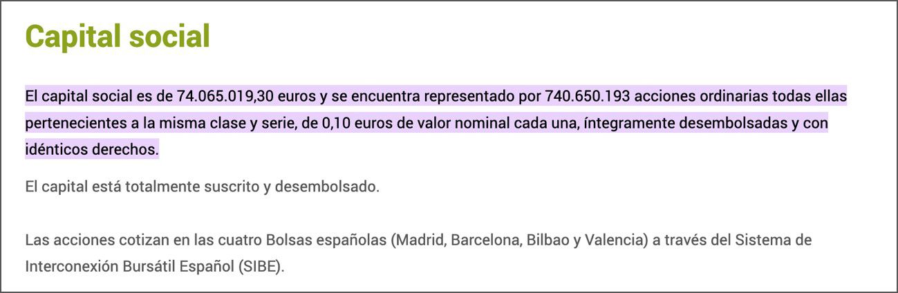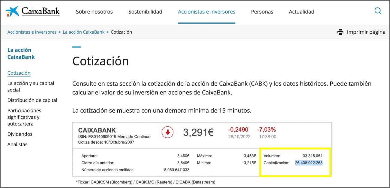 Veamos un ejemplo con Caixabank. Según aparece en su apartado de Caixabank accionistas, la entidad cuenta con un capital social de 8.060.647.033 euros repartidos en 8.060.647.033 acciones de un euro cada una: